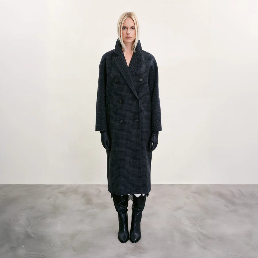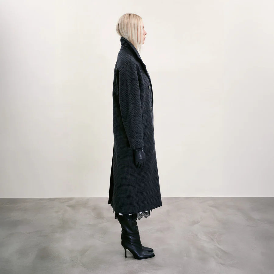 Segreen and Navy Check Tweed. Double-breasted silhouette with voluminous sleeves and an optional belt. Belt loops are provided for the client’s preference. This luxury coat requires four metres of fabric to cut and measures 123 cm in length. Tailored in superfine lambswool herringbone tweed, woven exclusively for The Landskein by Molloy & Sons of Donegal.