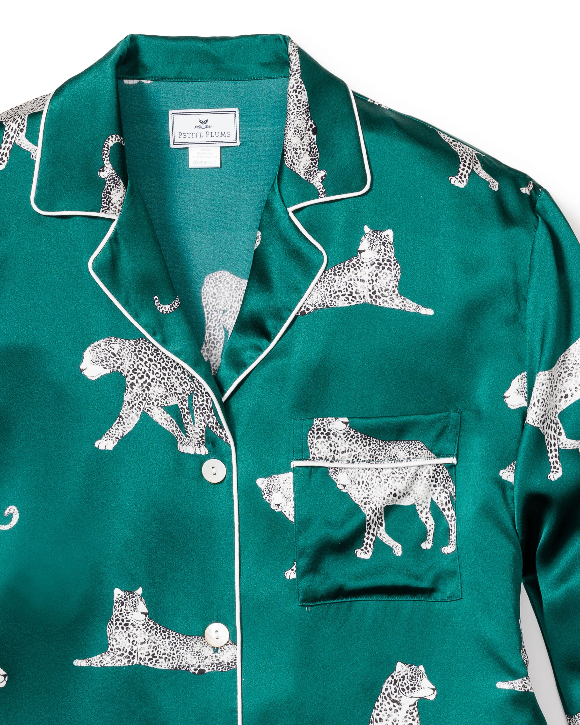 Boasting a prowling panther print atop a lustrously emerald green backdrop, our bestselling Panthere de Lux set is the playful update you need for your nighttime repertoire. Crafted from 100% 22mm Mulberry silk completed with contrasting piped trims, lending refinement to your lounging edit.