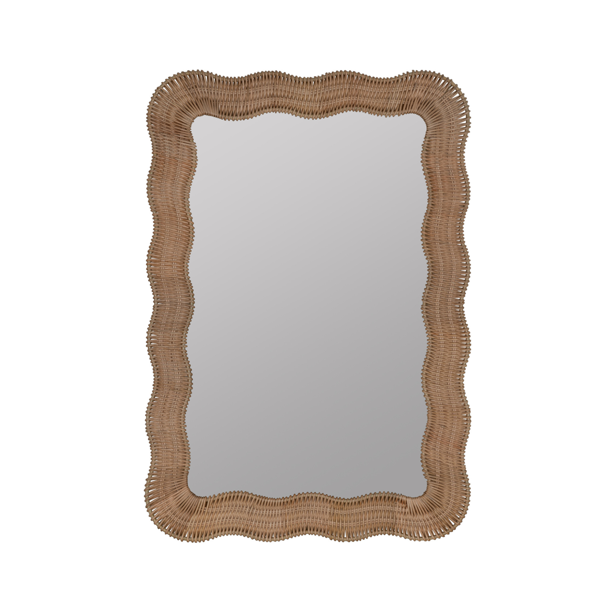 Introducing the Cooper Classics x Erin Gates Scalloped Linden Mirror. Made from exquisite rattan with a natural finish, this mirror evokes a charming coastal feel. Its scalloped edges add a lovely touch, making it a must-have for any elegant and exclusive space. Elevate your décor with this beautiful piece.